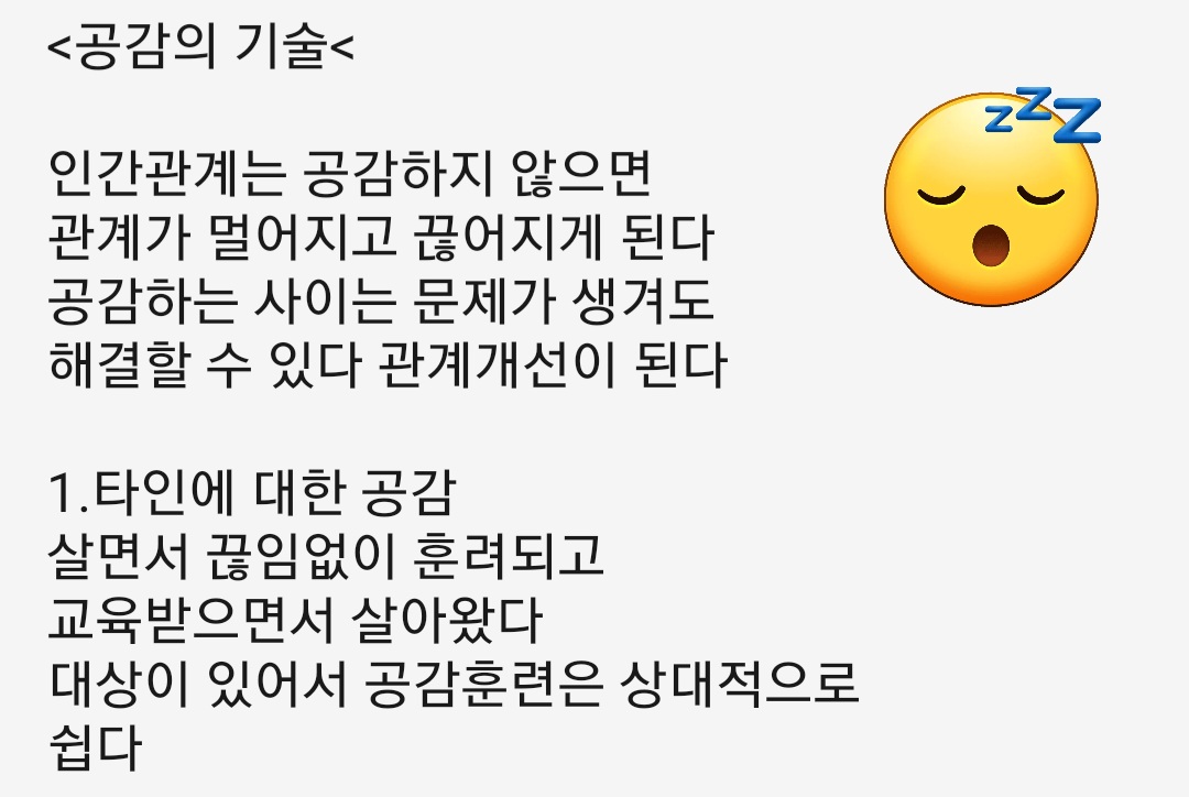 인간과계는 공감하지 않으면 관계가 멀어지거나 끓어지게 되어 있는데 공감하는 사이는 문제가 생겨도 해결할 수 있고 관게 개선이 된다고 합니다